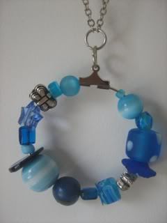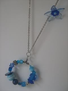Colar. Contas de vidro, sintéticas, metálicas, millefiori, flores,... em tons de azul. DISPONÍVEL