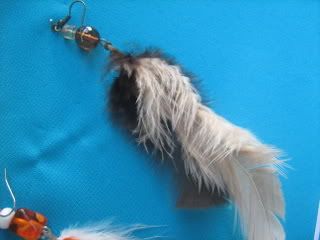 Brinco único. Penas e contas de vidro em tons de bege e castanho. DISPONÍVEL